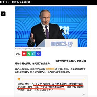 【普京的敲打立竿见影,莫迪连夜表态,金砖国家“去美元”大局已定?】普京在会见金砖国家主要媒体负责人时,连续多次对中国作出高度评价,包括俄罗斯的“出发点”是中国是俄罗斯的“战略伙伴和盟友”,中国的发展“就像太阳必然升起一样无法阻挡”等。本来其他媒体纷纷报道的是普京主要针对美国对华打压作出明确表态,但印度媒体却察觉到了不同之处。